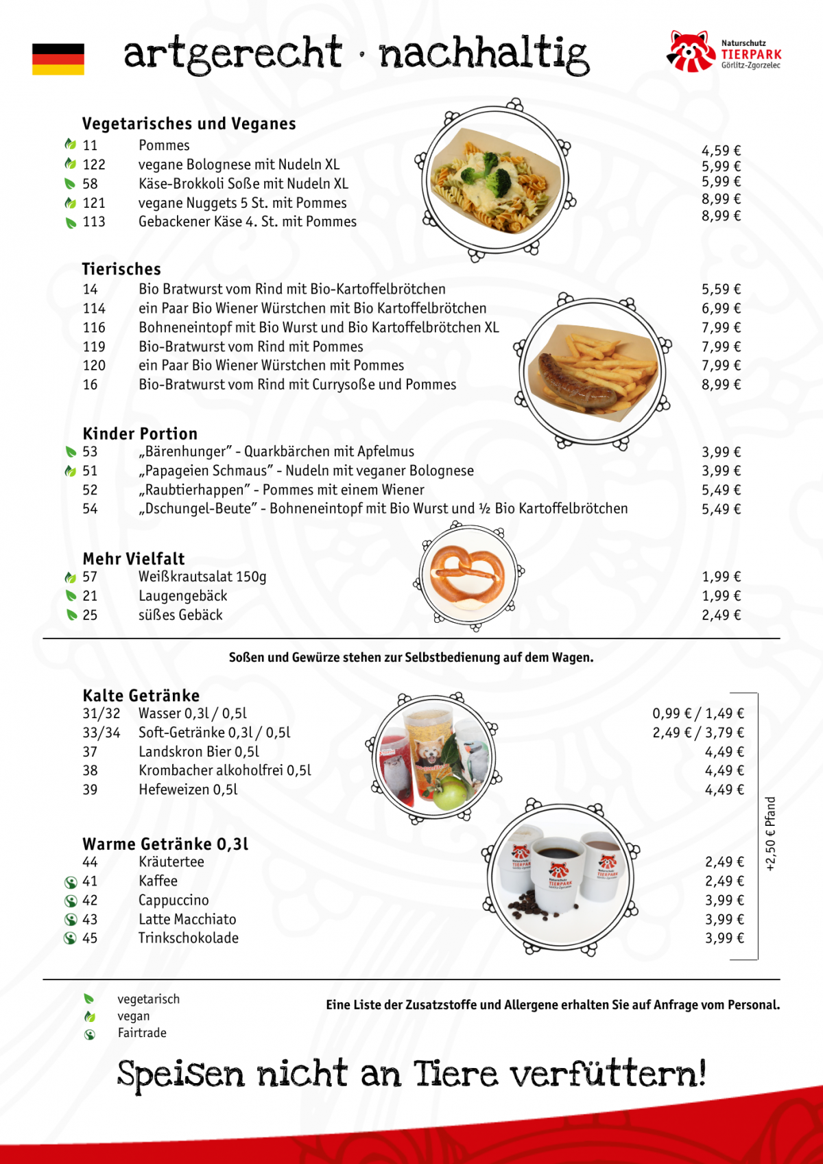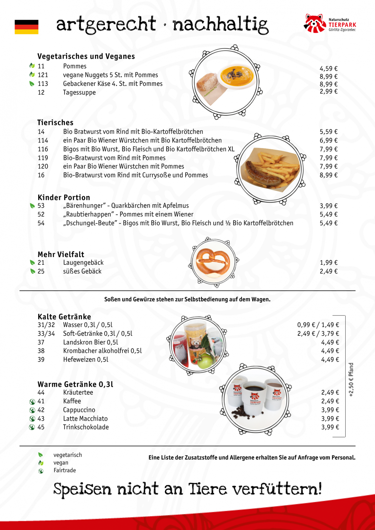 Zugleich versuchen wir der Wegwerf-Mentalität entgegenzuwirken: Die Getränke gibt es, frisch gezapft oder gebrüht, in eigens entworfenen Tierpark-Mehrweg-Bechern. Der Umwelt zuliebe haben wir uns für ein etwas aufwendigeres Pfandsystem entschieden, welches wir erfolgreich mit unseren Gästen realisieren. An den Stellen, an denen Mehrweg nicht möglich ist, wird nachhaltiges Einweggeschirr eingesetzt.