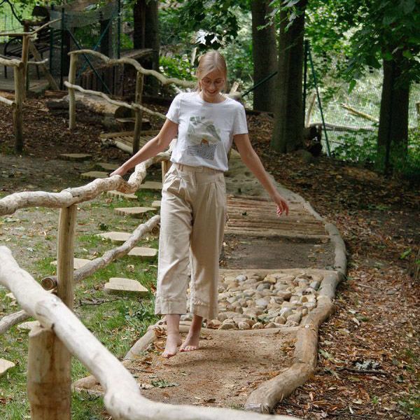 Erstmal Schuhe ausziehen und ab ins Regal damit, sonst wird das nichts mit dem Fühlen. Etwas pieksig geht es mit Mineralgemisch los, bis die sonst so wohlig verpackten Füße auf weicher Wiese die erste Ruhepause finden. Über große Kiesel, Erde, von Insektengängen gemaserte Rundhölzer oder Bambus führt dich der Barfußpfad und verspricht neue Sinneserfahrungen für Groß und Klein.