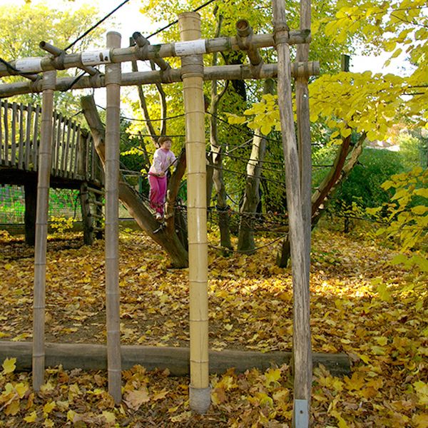 Außerdem ist Bambus ein sehr starkes Material, was Du auf diesem Spielplatz selbst testen kannst. Er ist sogar reißfester als Stahl und wird immer häufiger als Baustoff und in der Industrie genutzt. Von Zahnbürsten bis hin zu Fahrradrahmen wird er verwendet.