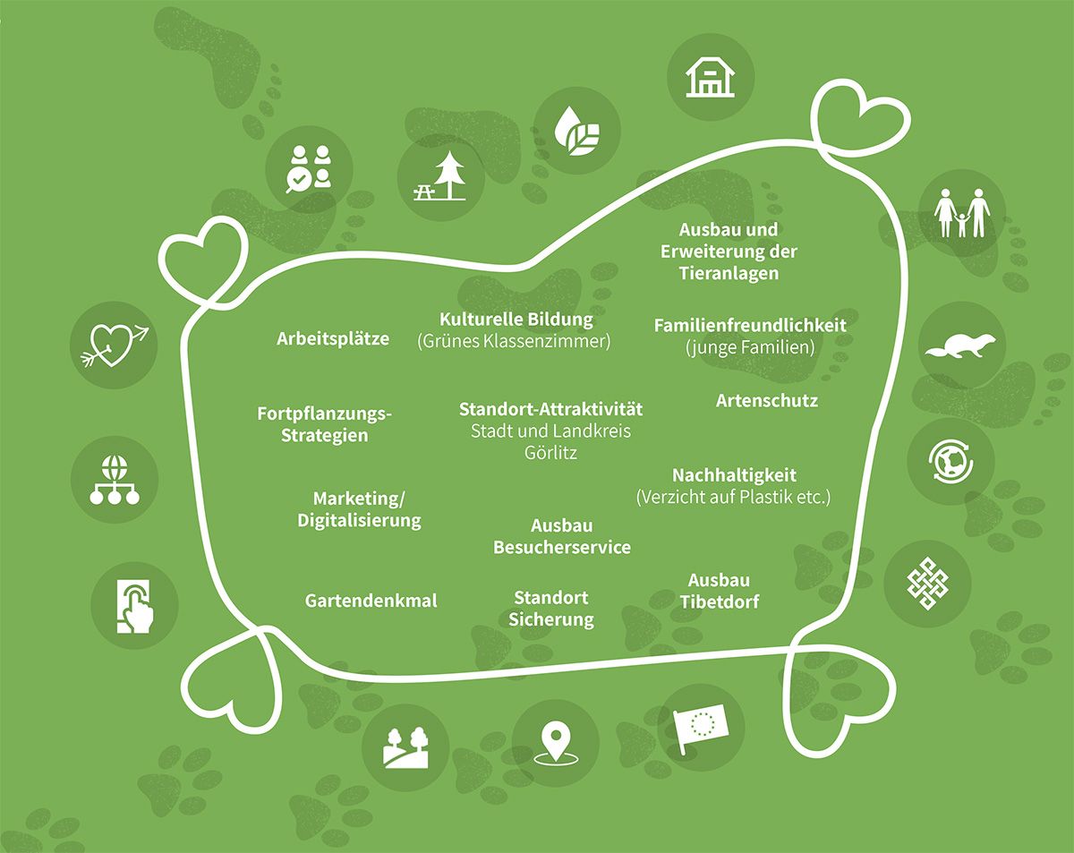 Daher sehen wir den Tierpark als ein Begegnungszentrum für Mensch und Tier, in dem auch in Zukunft Bildung für nachhaltige Entwicklung, Tiernähe und Erholung für alle Gesellschaftsschichten und Altersgruppen ermöglicht werden. Besonderes Augenmerk legen wir dabei auf die Qualität unserer Tierhaltung und die Zufriedenheit unserer Besucher. Im Einklang mit der Welt-Zoo-Naturschutzstrategie werden wir auch weiterhin unseren eingeschlagenen Weg fortführen und gemeinsam mit unseren Besuchern, Unterstützern, Spendern und der Politik unsere Zukunft