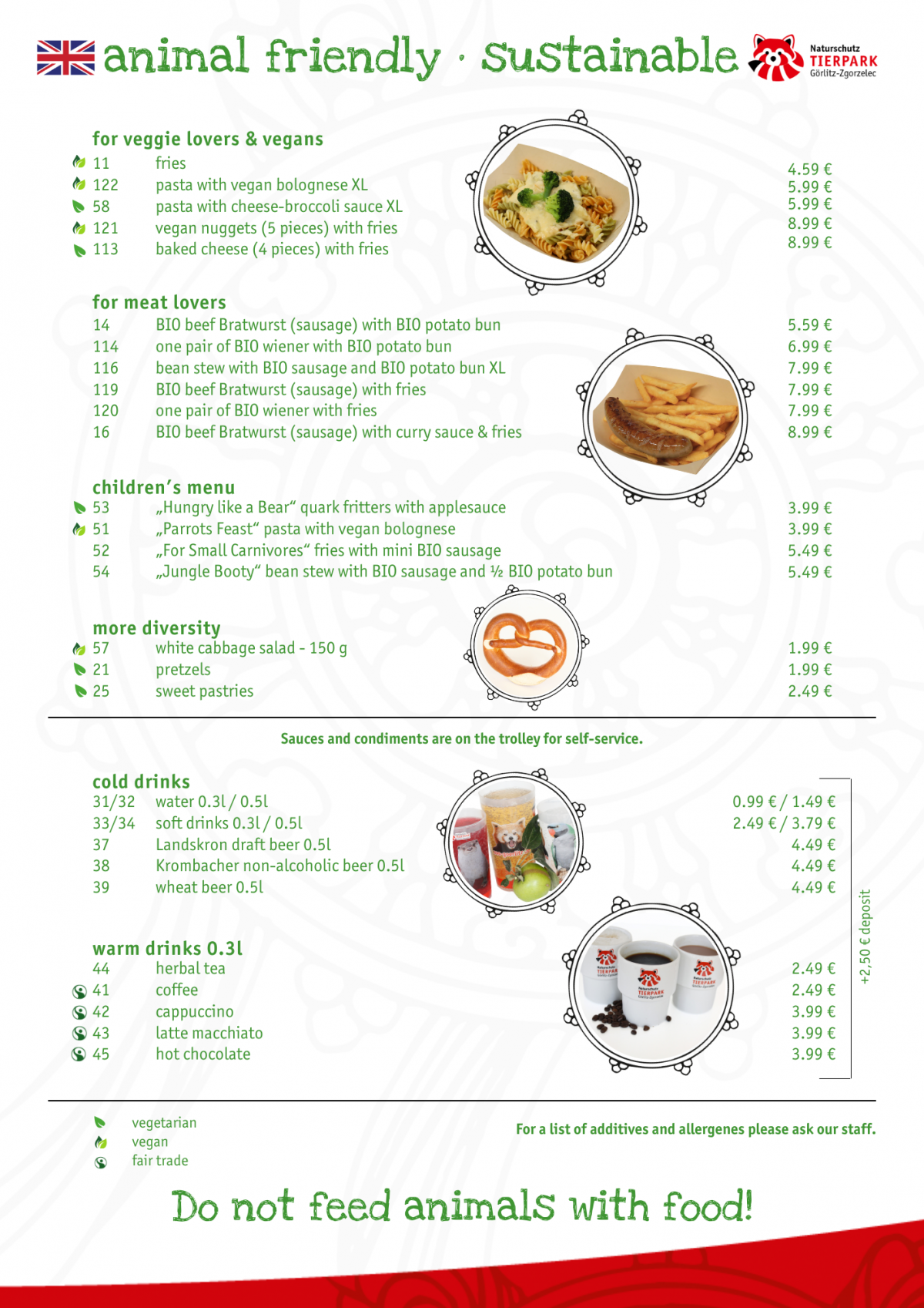 At the same time we try to counteract the disposable mentality: freshly tapped or brewed beverages are available in specially designed animal park reusable cups. For the sake of the environment we decided on a somewhat more complex deposit system which we successfully implement with our guests. Sustainable disposable tableware is used in places where an reusable alternative is not possible.