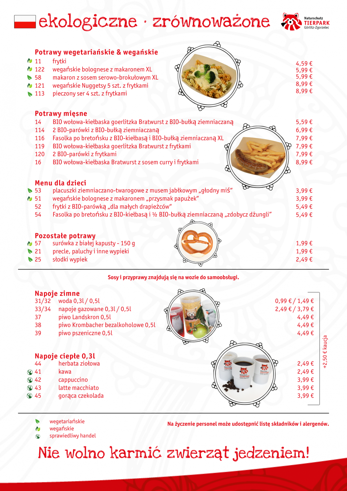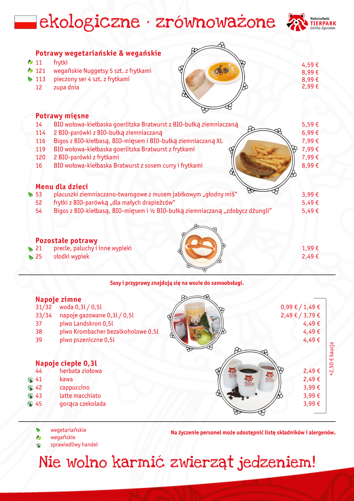 Menu zostało opracowane z uwzględnieniem naszego środowiska oraz wyzwania przyszłości: produkty są głównie regionalne, pochodzą z ekologicznych, zrównoważonych hodowli, a tym samym są zgodne z koncepcją zrównoważonego rozwoju, która charakteryzuje cały nasz park.