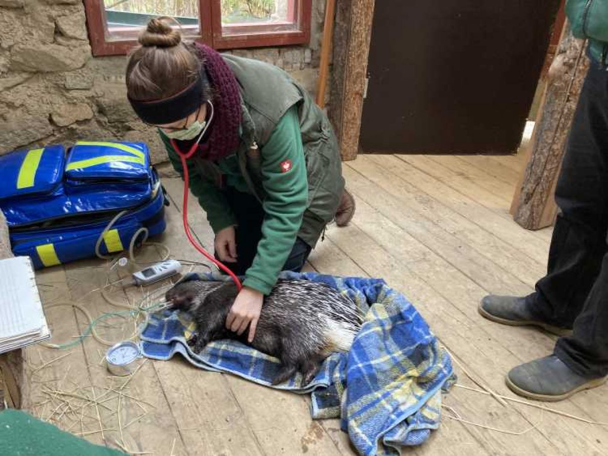 Lekarz weterynarii w zoo Goerlitz V.Michel podczas badania jerzozwierza